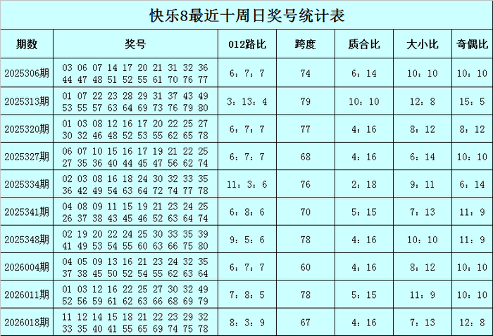 福彩快乐8第2026018期(上周日)开奖回顾:11 12 14 15 18 21 22 23 29 32 33 35 40 41 55 65 69 74 75 78,其中奖号012路比为8:3:9,跨度为67,质合比为4:16,大小比为7:13,奇偶比为12:8。