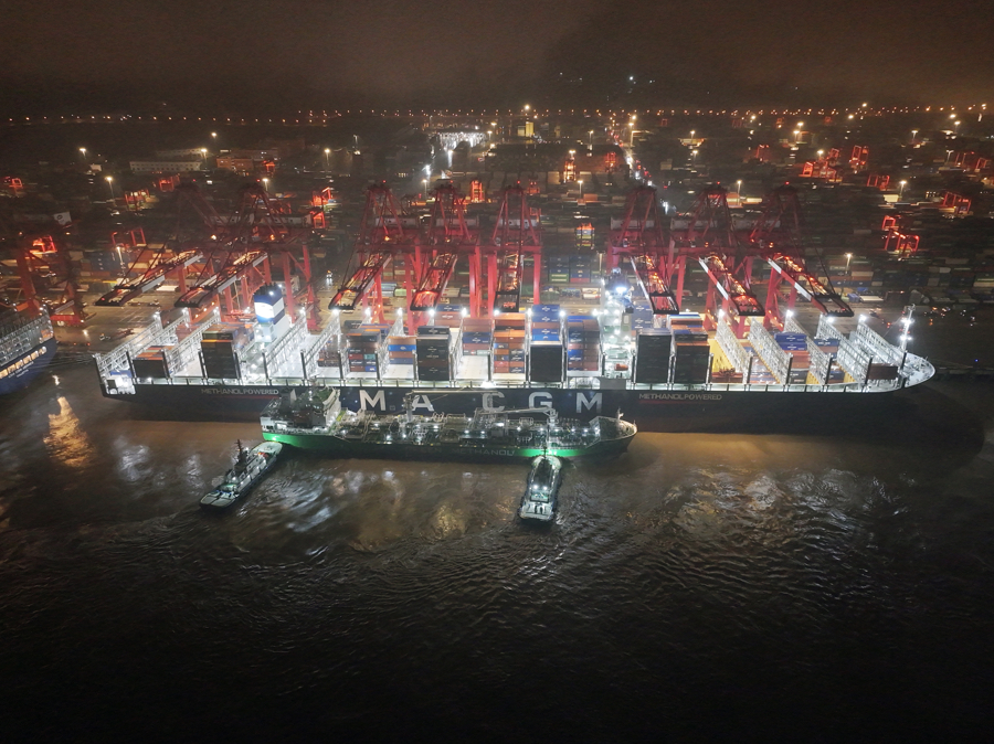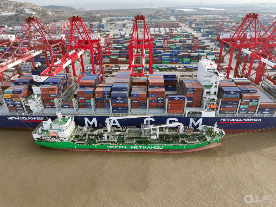 3月5日晚,甲醇加注船“海港致远”轮在洋山港盛东船埠为达飞“欧斯米姆”号集装箱船在船舶装卸集装箱时同步加注国产绿色甲醇燃料。