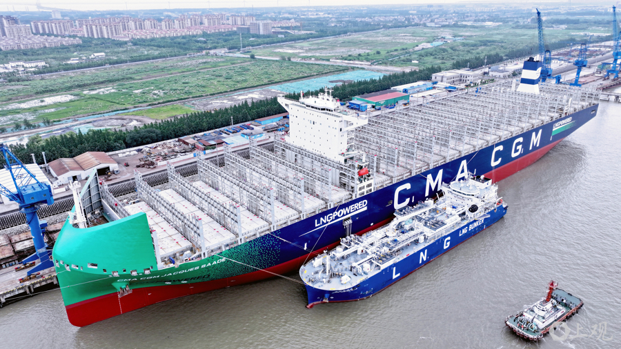 昨年6月20日,长兴岛上海中远海运重工船埠,LNG加注船“淮河动力出发”号成功完成对达飞雅克“萨德”23000TEU双燃料集装箱船的LNG燃料补给功课。这也进一步端庄上海港在环球绿色航运管事采聚首的关键地位。
