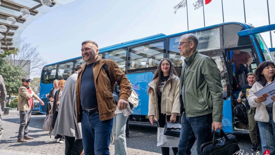 昨天11:40许,两辆载着61名俄罗斯旅客的蓝色大巴先后驶抵上海中心J货仓。旅客们一下车,便收到了地接旅行社、货仓职责主说念主员的和蔼宽饶:“Welcome to Shanghai!(宽饶来上海)”
