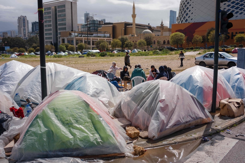 3月20日,黎巴嫩贝鲁特海滨地带,流荡异域者坐在盖着挡雨塑料布的临时帐篷旁。\n 新华社/法新