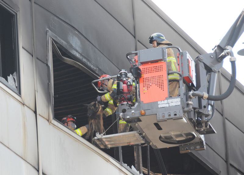 3月21日,转圜东说念主员将搜救犬送入韩国大田工场失火现场进行搜救。 新华社记者 张粲 摄