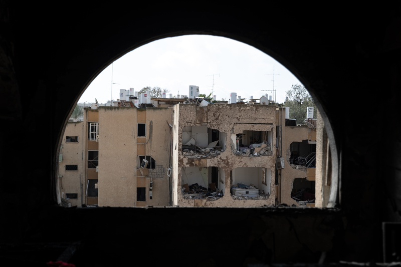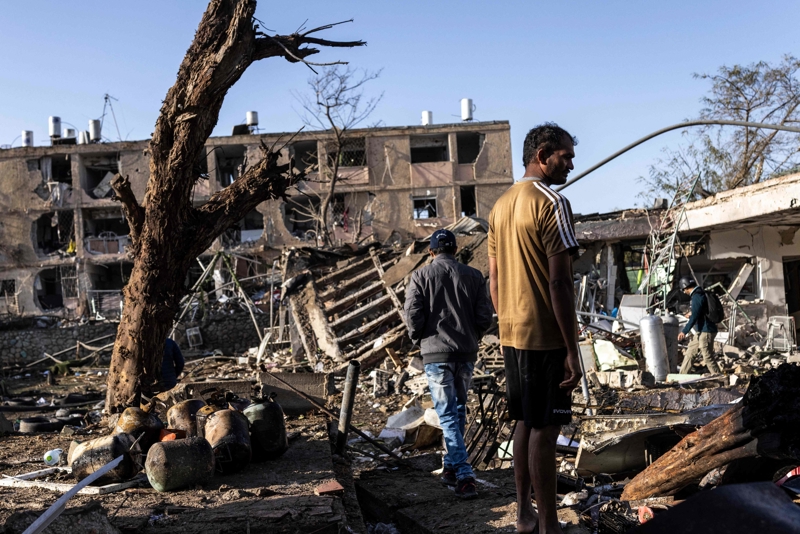 3月22日,以色列南部城市阿拉德,东说念主们在遭袭受损的住户楼间稽查情况。\n 新华社/好意思联