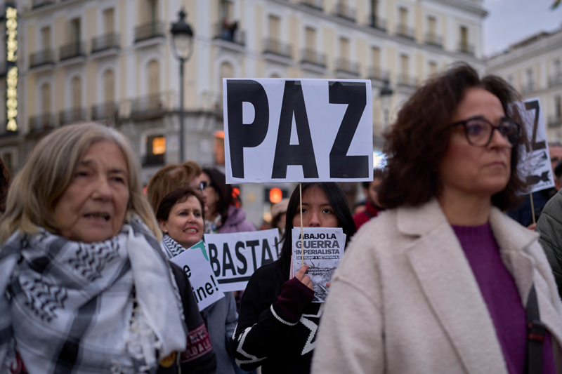 3月21日,东说念主们在西班牙马德里干与荟萃,抗议好意思国和以色列对伊朗发动军事打击。 新华社/好意思联