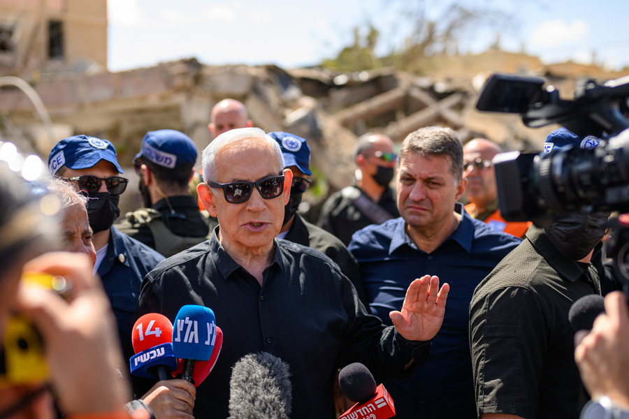 3月22日,以色列迪莫纳,以色列总理内塔尼亚胡在迪莫纳市长本尼·比顿(左)跟随下,就前一晚伊朗弹说念导弹进军导致50余名住户受伤事件采取媒体采访。