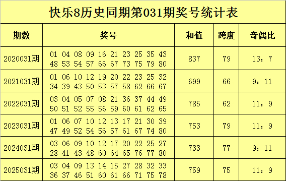 奇偶比分析:去年第031期奖号奇偶比为11:9,历史同期第031期奖号奇偶总比例为64:56,奇数号码表现较热,今年第031期预计奇偶号码表现与理论基本相当,推荐奇偶比9:11。