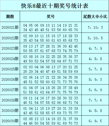 福彩快乐8第2026030期开奖回顾:02 08 12 13 14 16 23 31 37 39 44 46 50 54 55 59 61 69 70 73,其中包含6个小尾奖号:02、12、31、50、61、70;包含9个中尾奖号:13、14、16、23、44、46、54、55、73;包含5个大尾奖号:08、37、39、59、69。