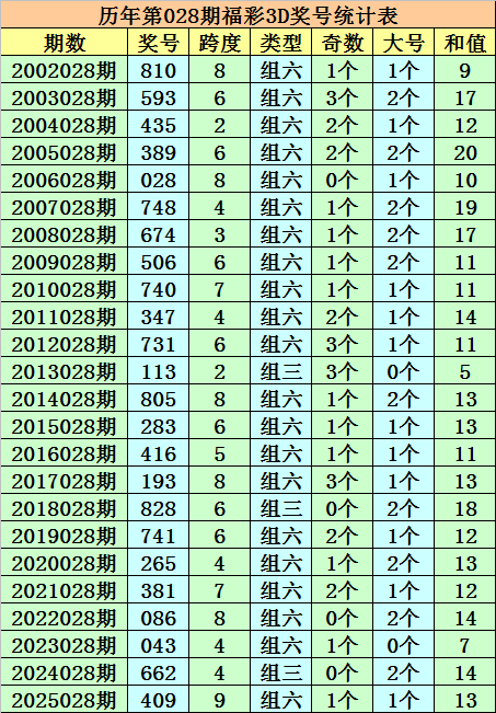 历年第028期福彩3D同期奖号为:810 - 593 - 435 - 389 - 028 - 748 - 674 - 506 - 740 - 347 - 731 - 113 - 805 - 283 - 416 - 193 - 828 - 741 - 265 - 381 - 086 - 043 - 662 - 409。