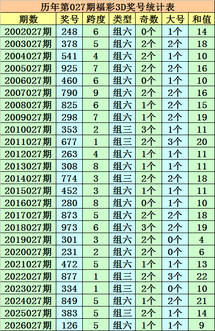 在以上奖号中奖,历年第028期福彩3D出现3次组三,出现21次组六。组六开出比例较高,本期继续关注组六。