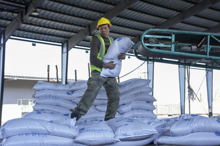 2026年3月17日,工东谈主在位于黑龙江省绥化市的哈尔滨铁路物流中心绥化贸易部农资装卸功课现场卸化肥。新华社记者 王松 摄