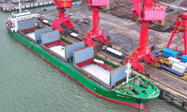 2026年3月18日,在江苏张家港锦高峻件船埠,海外飘零船舶在泊位上有序卸运入口化肥(无东谈主机像片)。新华社发(赵国政摄)