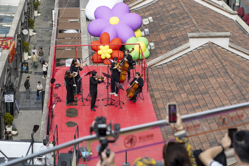 4月4日,俄罗斯莫斯科国立柴可夫斯基音乐学院独奏家室内乐团在百年小巷屋顶演奏。4月4日,第41届“上海之春”文艺轻马队惠民行虹口专场首场上演在“滨港生意中心今潮8弄”启幕。俄罗斯莫斯科国立柴可夫斯基音乐学院独奏家室内乐团来到百年小巷屋顶演奏,为市民呈现千里浸式艺术盛宴。\n 新华社记者 王翔 摄