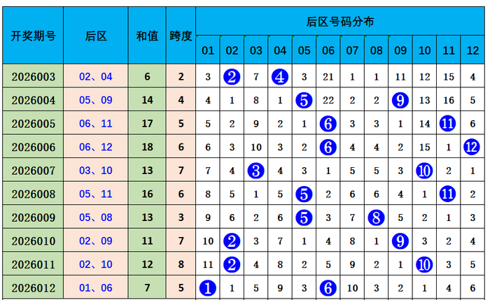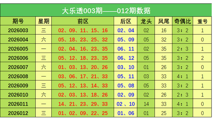 大乐透第2026012期出奖号统计:前区01、02、09、22、25,后区01、06。龙头01,凤尾25,奇偶比3:2,未开出重号。