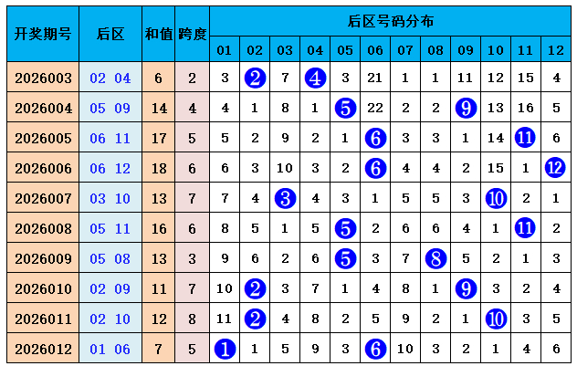 跨度分析:上期后区跨度为5,与前期相比下降3个点位,预测本期跨度走势波动下降,推荐两码跨度1--5