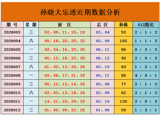 上期回顾:大乐透第2026012期奖号:前区01、02、09、22、25,后区01、06,前区奖号和值为59,012路比为1:3:1,后区开出小小组合01、06